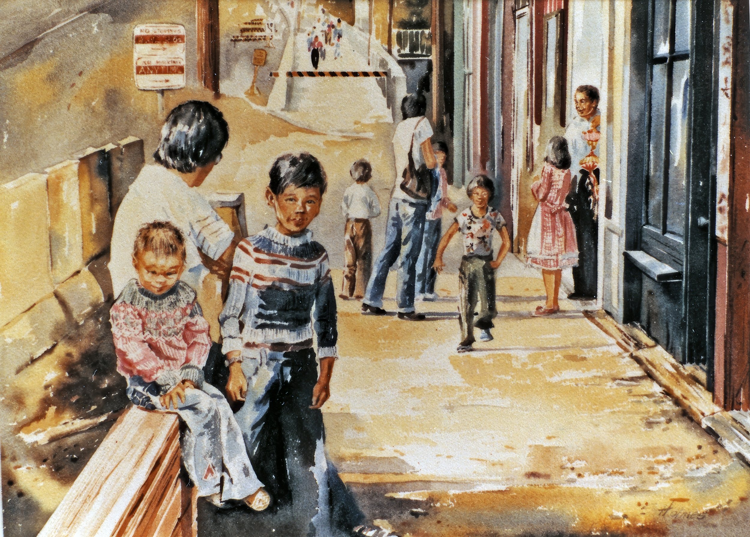 View fullsize  <strong>Corner of Centre and Third</strong>  Chinatown Series  Watercolour  28” x 36”  1981  —  SOLD —