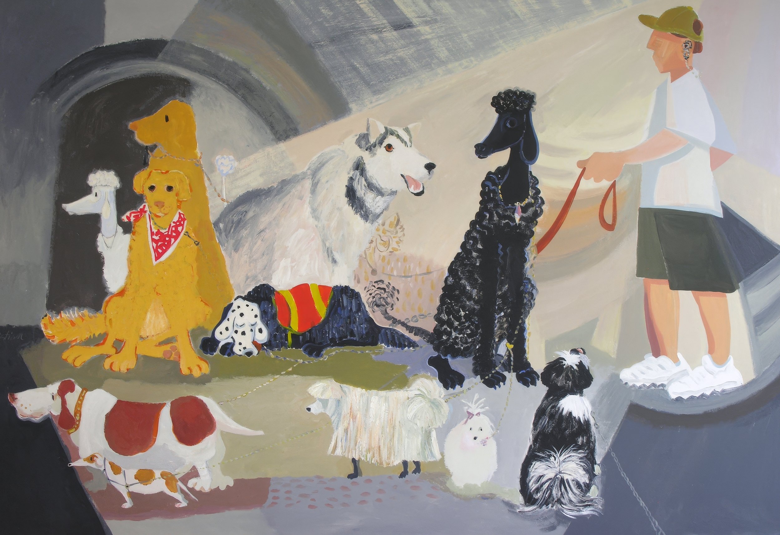 View fullsize  <strong>The Dogwalker</strong>  Designer Dogs Series  Acrylic on Canvas  51” x 75”  2007  — Available from Artist's Collection —