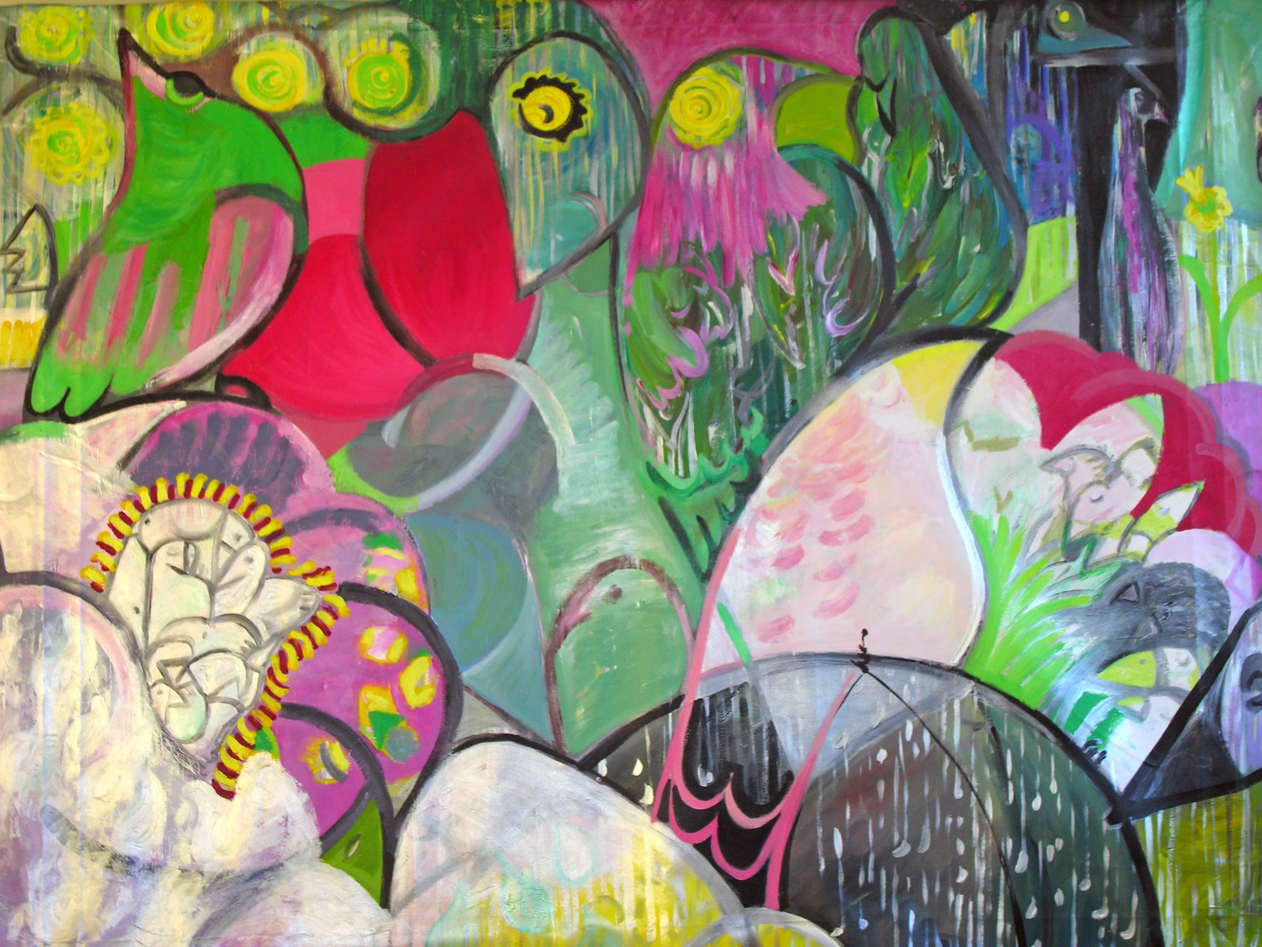View fullsize  <strong>Walking with the Summer Crows</strong>  The Lost Garden  Acrylic on Canvas  65” x 91”  2001  — Available from Artist's Collection —